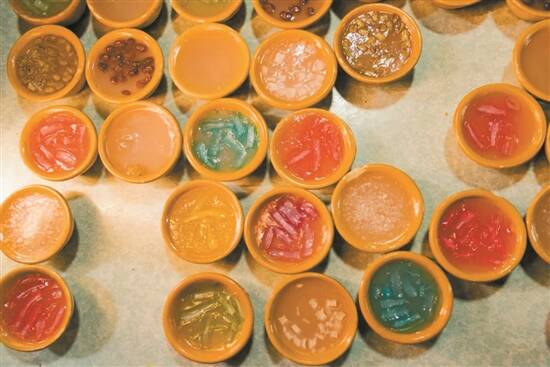 传统钵仔糕用的是粘米粉和澄面,米浆混合各色配料,再置入一个个钵仔中,开蒸后水蒸气会使得糕体表面呈现一个小小的凹陷,也有人将它称为钵仔糕的“酒窝”,是传统钵仔糕独有的可爱印记。这种钵仔糕整体是瓷实、不透明的,口感更为扎实,就像是更干的布丁。还有经典的红糖味、椰奶味甜而不腻丝丝入扣,也有不少改良的口味像斑斓叶味、奥利奥味、咸蛋黄味、抹茶味……深受年轻人的喜欢。