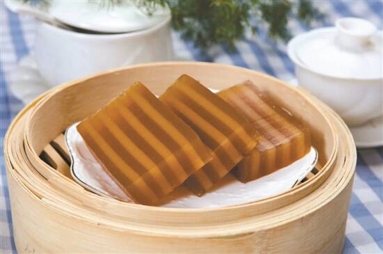 很适合夏天的还有椰汁千层糕与马蹄糕,两者同样是用马蹄粉为原料,Q弹之余又带着浓浓的椰香,甚至冰镇后更好吃。千层糕的搭配千变万化,可加斑斓叶,可加桂花糖,还可加红枣、红豆、芒果等,如果第一次接触广式甜糕,从千层糕吃起几乎不会有人拒绝。