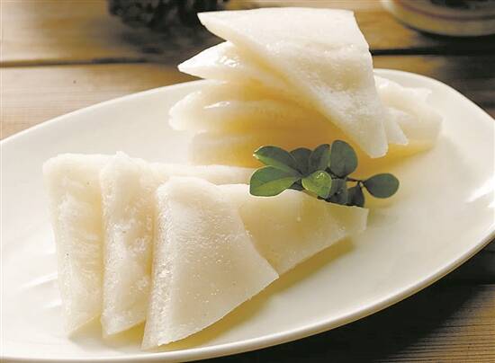 以顺德最有名的“欢姐伦教糕”为例,她们选用直链淀粉含量更高的隔年籼米,做出来的米糕会有紧密连接的分子团,口感柔韧不松散,虽然是籼米制成的糕点,却神奇地有着糯米般软糯的口感。打出细幼的米浆后,还得控温发酵一整夜,待淀粉水解后产生葡萄糖、发酵产生乳酸后才能下锅去蒸。“猪膏面,横直眼”形容好的伦教糕表面要晶莹光滑,但横截面要有横竖相连的气孔。刚出炉的伦教糕不要急着吃,等放凉了,大米带来的酸甜味会平衡得更好,也更能消暑增加食欲。