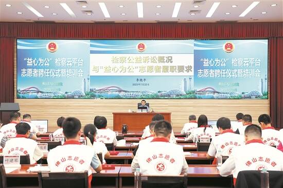 羊城晚报讯 记者黄松炜,通讯员黄洁、郭嘉泳摄影报道:7月22日,佛山市人民检察院举办“益心为公”检察云平台志愿者聘任仪式暨培训会,各区检察院以视频连线形式同步开展活动。首批200余名“益心为公”志愿者,涵盖人大代表、政协委员、律师、专业领域专家、社会组织工作者等,今后将参与办案环节,履行公益保护志愿者职责,助力检察机关高质量办理公益诉讼案件。