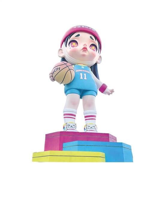 驶过东莞大道,市民游客总会被一座矗立在海德广场的巨大潮玩雕塑所吸引。这座雕塑名为“Laura·篮球城市”,是由东莞潮玩品牌X11和ToyCity合作推出的作品。为迎接第十三届漫博会而更新配色的Laura双手紧握篮球,如同星空深邃的目光凝视着整座城市,身穿“多巴胺”色彩球衣,尽显潮玩之都青春活力。