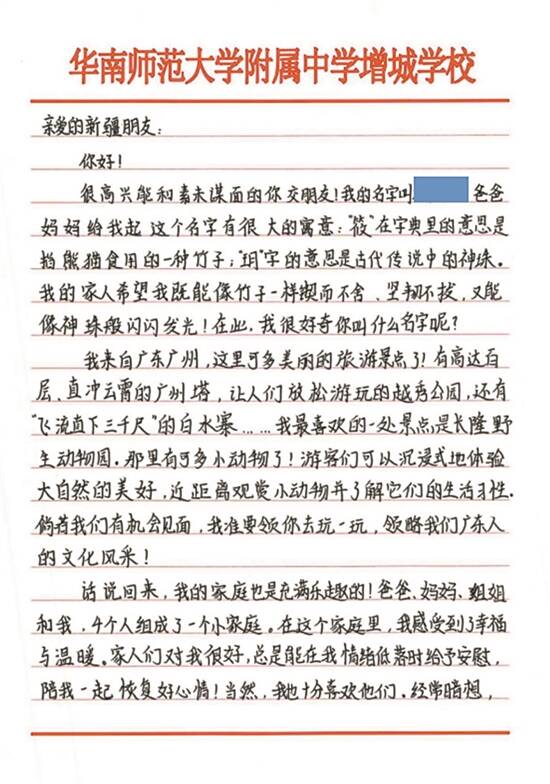 “我们的学校坐落在远负盛名的‘荔枝之乡’——广州增城,‘岭南佳果数荔枝,荔枝之多在增城’,就是形容我们所居住的地方……”华附增城学校初一学生古金峰在信中重点介绍了他的学校和居住地增城,化身为小导游,把身边的美景和发生的趣事向喀什的同龄朋友娓娓道来。