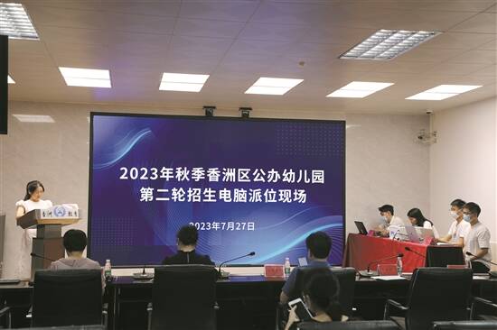 羊城晚报讯 记者陈一典报道:7月27日下午3时,2023年秋季珠海市香洲区公办幼儿园第二轮招生电脑派位仪式在香洲区教育局举行。参与第二轮招生的公办幼儿园共19所,学位1467个,共有1216名适龄幼儿报名,其中香洲区户籍幼儿779人,非香洲区户籍幼儿437人。