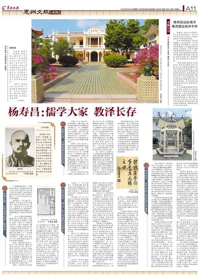 “学校的建设发展离不开杨寿昌!”良井中学相关负责人介绍,1927年,杨寿昌开始在家乡良井号召有识之士筹建中学。1929年夏,他率领良井中学董事长杨季明等远赴南洋,在新加坡和马来西亚等地发动华侨捐赠,共募得16800元。如今,校园内有一座中西合璧的民国教学楼,便是这段历史的见证。虽历经风雨,教学楼依然光彩夺目,是惠阳区文物保护单位。