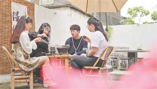 胡文杰(右二)与周颖欣(左二)围炉煮茶