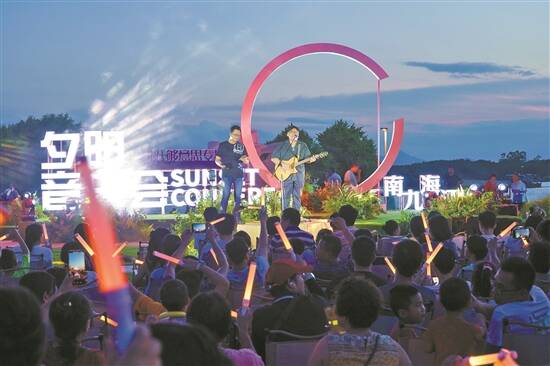 羊城晚报讯 记者黄松炜、通讯员刘颖君摄影报道:《拒绝再玩》《漫步人生路》《凭着爱》《甜蜜蜜》……一首首南海九江街坊们的“饮歌”在晚风中飘荡。8月5日晚,九江儒林湾夕阳音乐会“啡跃·够意思”专场在南海九江源林湿地公园举行,熟悉的旋律在西江之畔唱响,带动了全场大合唱。