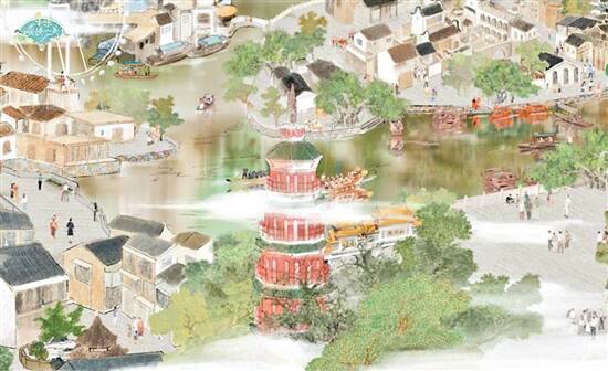 据陈志杰介绍,坐落于顺峰山公园内的青云塔,建于明代万历年间,是为了兴盛文风而建,长卷的主体色便是取自青云塔上琉璃瓦的铜绿,同时还结合了水乡流动的绿色以及青砖墙的青灰色。