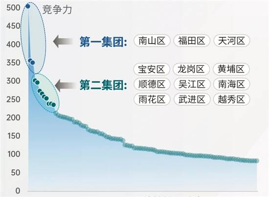 榜单从不同维度对百强区进行了划分。整体来看,梯队内部城区竞争日趋激烈,梯度差距有所缓解。从高质量发展水平得分来看,前12个城区可划入第一梯队,且第一梯队内也可划分为两个集团。来自广东的南山区、福田区、天河区为第一梯队第一集团,竞争力得分在500—350区间。宝安区、龙岗区、黄埔区、顺德区、吴江区、南海区、雨花区、武进区、越秀区为第二集团,竞争力得分在300—200区间。上述第一梯队的12个城区中,广东城区就占了9个。