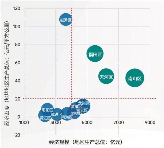 以5000亿元、3000亿元为分界线将35个“两千亿城区”划分为三个梯队。其中,第一梯队的深圳南山区成为全国首个地区生产总值突破8000亿元的地级市市辖区,其高总量、高增速特征明显,广东3个城区深圳南山区、广州天河区、深圳福田区包揽了超5000亿元的第一梯队。地区生产总值在3000亿-5000亿元区间的第二梯队城区增至12个,广东的深圳龙岗区、深圳宝安区、广州黄埔区、佛山顺德区、佛山南海区、广州越秀区6个城区上榜。第三梯队中,广东的深圳龙华区、广州番禺区、深圳罗湖区、广州海珠区、广州白云区、佛山禅城区上榜。