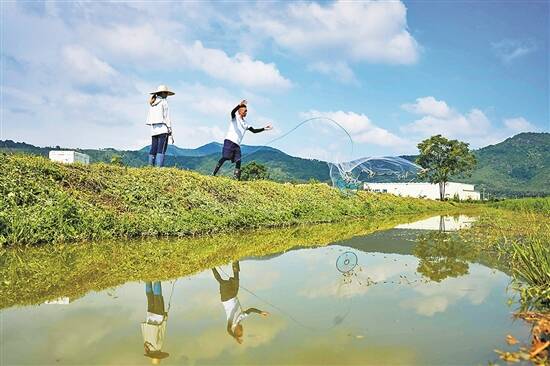稻田青青,鱼虾欢跃。八月盛夏,在广东省河源市和平县彭寨镇土厘村,50余亩连片水稻长势喜人,绿油油的稻田与连绵起伏的青山、纵横交错的河沟交相辉映,让人心旷神怡。傍晚,广东青年大学生“百千万工程”突击队重点项目华南师范大学“优‘渔’助乡”团队成员正在“稻虾共作”田埂上撒网捕虾,这些罗氏沼虾取样后将送达华南师范大学生命科学学院水产动物健康养殖与环境控制实验室进行“体检”,为当地实现现代名特优水产动物健康养殖提供科学支撑。