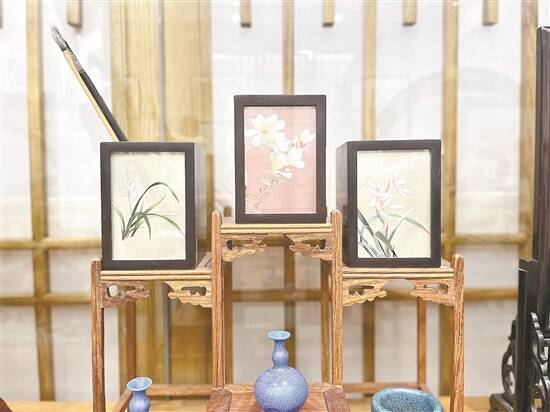 在静圆·莞,不仅有各类中式美学文创产品和传统文化体验齐聚一堂,李芸静去年还结合东莞特色,设计制作了东莞八大景刺绣、白玉兰花胸针、白玉兰花和岭南荔枝刺绣笔筒等具有本地特色的文创产品。记者在现场看到,手工苏绣技艺一针一线绣制的荔枝和白玉兰花,在不同角度下都散发着闪亮的光泽,尽显古朴精致感。