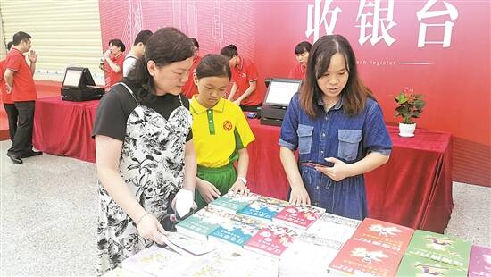 家长陪同少年在任溶溶童书专区挑选童书