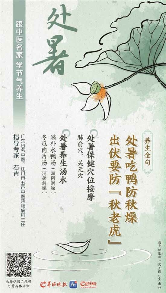 “三伏”谢幕,处暑来到。“处暑”有“暑气至此而止”之意,然而岭南此时暑气未消,正是“处暑天还暑,好似秋老虎”。广东省名中医、江门市五邑中医院脑病科主任石青提醒,处暑之时,要防秋乏与秋燥,注意及时补水润燥,早睡早起。