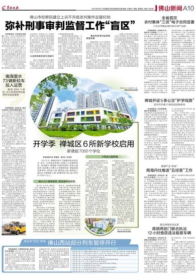 8月31日,禅城区举行了新建学校启用仪式,其中,主会场设在佛山市第九小学普君校区。新学期中,禅城有2所新学校和4所幼儿园启用,包括佛山市第九小学普君校区、禅城区绿岛湖学校、同悦幼儿园、德信幼儿园、诚悦幼儿园和白兰春晓幼儿园,新增学校(幼儿园)学位共7000个以上。
