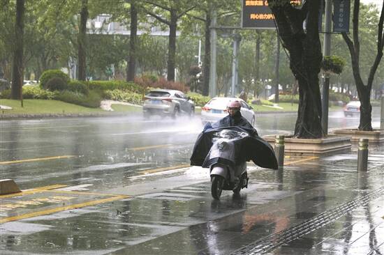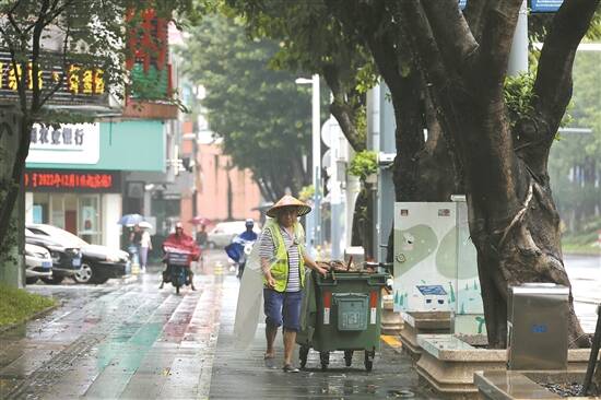 雨势稍缓环卫工上街打扫路面 王泽宝 摄