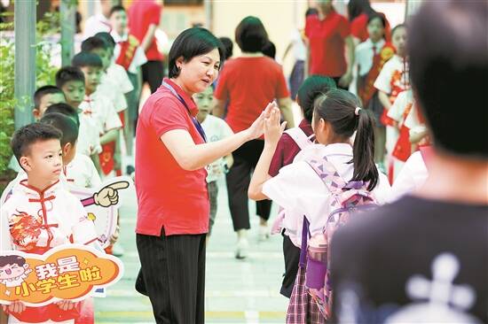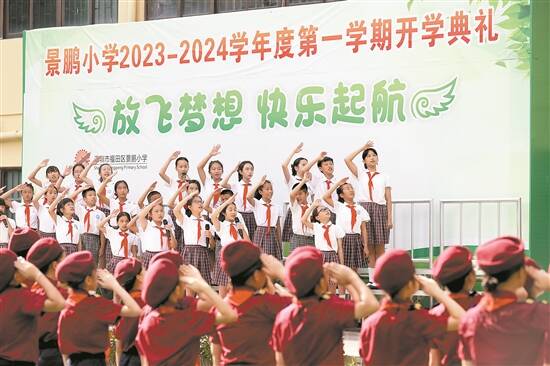 天健小学开学典礼上,古筝、汉唐古典舞、书法精彩相融。怡景小学的老师则精心为孩子们准备了一份“专属礼物”——糖果、零食礼包。糖果被固定在小红花卡纸上,小红花的五个花瓣上依次写着“快乐新学期”5个字。看着孩子们高兴的样子,老师们的笑容里也透着甜蜜。