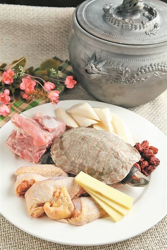 方解:草龟滋阴补虚、养血补肾、软坚散结,含有丰富的蛋白质、动物胶、钙、磷、铁等多种营养,容易被人体吸收。土茯苓祛湿、解毒、通利关节,更增加温胃散寒的生姜,养心安神的桂圆,相得益彰。本汤对于阴虚潮热、头晕目眩、筋肉疼痛、心虚健忘等情况皆适合饮用。