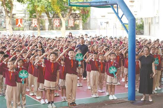 与往年不同,珠海边检总站茂盛围边检站组织民警走进珠海市金钟小学,融入该校2023年秋季开学典礼。8时30分,茂盛围边检站与金钟小学联合开展升旗活动,在指挥员“出旗”口令下,茂盛围边检站国旗护卫队成员精神抖擞,迈着坚定有力的步伐护卫国旗走向国旗台。