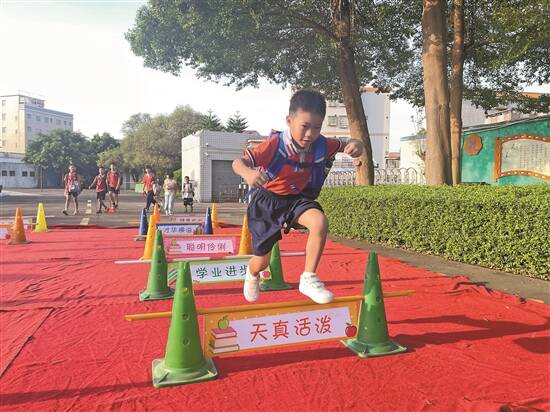 荷塘镇远昌小学学生跨过栏杆,寓意新学年迈过困难与挑战 受访者供图