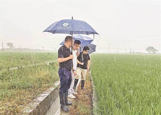江门台山相关部门人员冒雨查看农田情况
