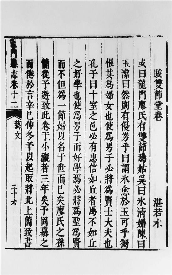 其中有一位名叫廖简的学子,便出自功武,其祖母吴氏和母亲陈氏数十年勤教子弟,品行高尚。湛若水闻之,欣然为其撰写《跋双节堂卷》:“廖氏有双节焉,姑吴曰‘冰清’,妇陈曰‘玉洁’……独恨其为妇女也,使为男子,必将为贤士大夫也。”
