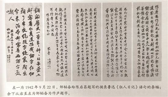 走进作庐,可以看到墙壁上悬挂着邹韬奋隐居在此时亲手书写的五条堂幅,其中一幅是摘录鲁迅先生《狂人日记》的语句,赠给陈启昌;另外四幅是为纪念“作庐”新居落成而写。可见,邹韬奋对陈作民、陈启昌一家感情至深,对在作庐隐居的时光甚是感慨。