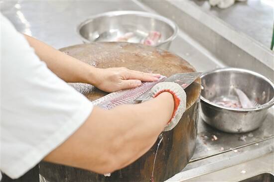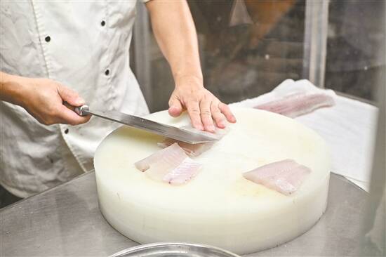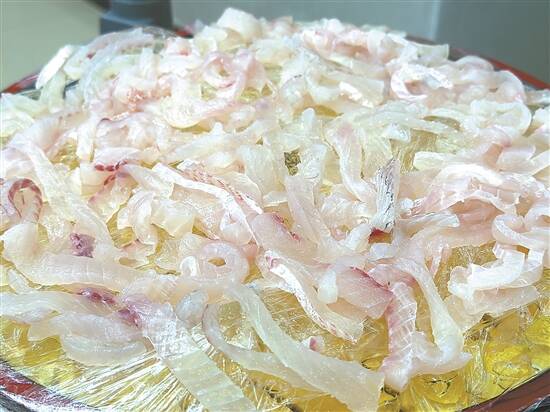 随后,林师傅用清水冲洗鱼身,再用吸水纸吸干水分,而后将鱼放平,一手按住鱼身,一手持刀紧贴鱼骨,横向将鱼身一侧的肉片下,再以同样的方法将另一面的鱼肉片下。接着,他将片下的鱼肉剥去鱼皮,剔除鱼骨与红肉,只留下雪白的部分。最后,便到了考验师傅刀工的时候,只见他手拿刀具,将雪白的鱼肉平铺竖切成片,放入竹筛中铺好。“鱼血、鱼头、鱼翅等,可以制成鲜美的鱼生粥。一条鱼全身都是宝贝,完全没有浪费。”林师傅说。