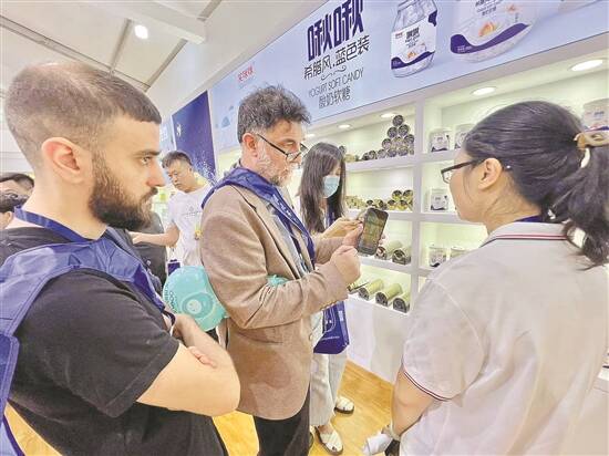 食品产业大会上,来自沙特的采购商向店家展示意向产品