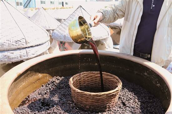 走进老字号酱油企业,工作人员正从酱缸中间的竹篓里,舀出汁水淋在酱醅上 赖嘉华 摄