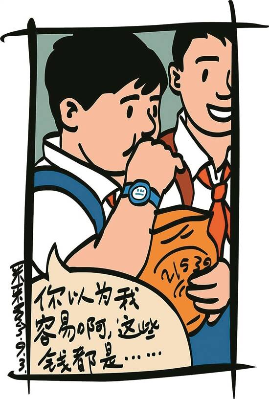 这天,爸爸提前下班,在学校附近埋伏等待,他决定从校门口开始跟踪瓜瓜,想看一下他到底有没有运动。等了好久终于等到放学时,就看见瓜瓜熟悉的身影从学校出来后,就立马窜入校门口的小卖部里,没一会,瓜瓜手里还抱着两包薯片和一罐汽水出来,站在门口的同学羡慕地说:“你就好啦,天天有零花钱买东西。”