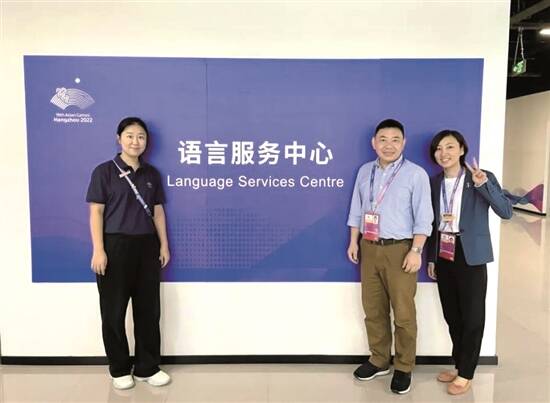 张晗、詹成、李旭在亚运会语言服务中心 来源:中山大学公众号