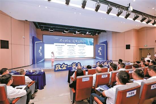 里水镇镇长邓秀娟为在场的企业家解读了“里水拼经济五十条”。现场还举行了里水金融协会挂牌仪式和佛山市医药保健品行业协会中医药高标准产业发展专业委员会挂牌仪式。