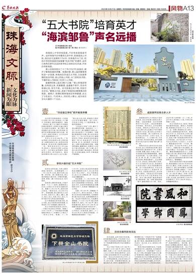珠海前山中学的校园里,不时传来琅琅读书声。这所珠海市办学最悠久的中学,前身是凤山书院,其历史可追溯到1754年;在珠海市斗门区,和风中学的校园里仍保留着“和风书院”的遗存,这所已有两百多年历史的老学校正深挖文化内涵,开拓办学新局面。