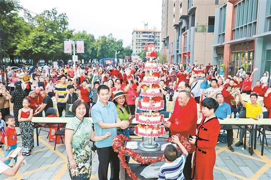 据了解,为了促进和谐社区建设,增进邻里关系,提高凝聚力,增强居民群众的归属感和幸福感,新安街道新乐社区党委同时举行了“邻里围桌宴·欢庆重阳节”活动。现场,居民共同享用了深圳的特色菜品——大盆菜,融荟一盆团圆,融洽邻里关系。大盆菜是一种混合了十几种食材的粤菜系客家菜的名肴,具有700多年历史,如今成为客家传统文化中一场别开生面的饕餮盛宴。新乐社区党委书记蔡剑峰介绍,本次大盆菜经费采取“三个一点”原则办起来,即政府出一点、企业出一点、个人出一点。百桌大盆菜盛大的场面,映照的全是“吃席”人的笑脸。