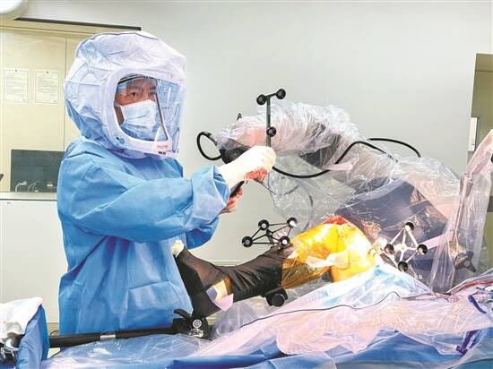 “机器人会把手术过程分解成一个个小关卡,主刀医生需要在机器人提示下完成任务才能进入下一关。比如在‘注册’这个任务里,机器人会显示虚拟的关节结构,在虚拟的骨头表面有若干小气泡,医生需要用特殊工具在真实的骨头上找到这些小气泡所在的位置,并确认‘戳破’气泡,准确戳中气泡就显示蓝色,不准确就是红色,如果红色气泡太多,那这个任务就不通过。”广州和睦家医院骨科主任李之琛解释,这对后面的手术步骤中的精准定位很重要,大大提高了手术的精确性和安全性。