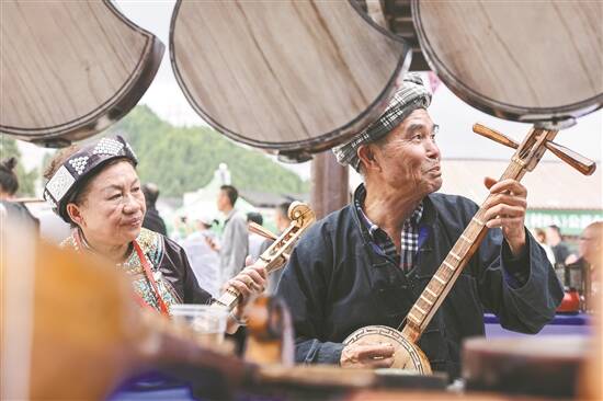 布依族艺人在台江县球场旁演奏月琴 新华社发