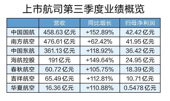 10月30日晚间,七家在国内A股上市的航空公司分别披露了今年第三季度财报。财报显示,今年第三季度,各家航司的营收都大幅增长,即使增长幅度最小的南航,也实现了62.42%的同比增长。七大航司单季盈利总额累计达176.4亿元。