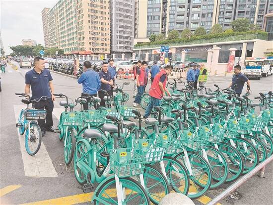 西乡街道组织人员整治乱停放的共享单车