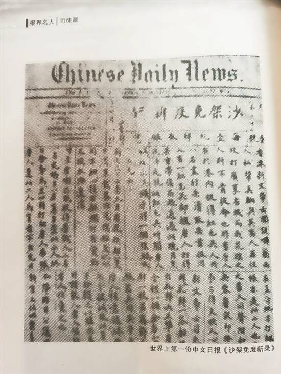世界上第一份中文报纸《沙架免度新录》由江门开平人司徒源创办 资料图