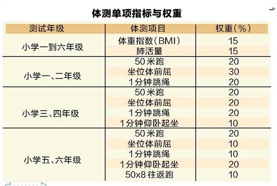 小学体测到底要考哪些内容?有大家很熟悉的跳绳、跑步、仰卧起坐等。全国的学生(从小学到大学)都要在每学年的第一学期,9月至11月这个时间段,接受学校统一安排的测试。小学生体测的总分是100分,在不同的年级段,每个项目都有各自的权重分配(见上表)。从表中可以看出,虽然五、六年级段跳绳的权重从20%降到了10%,但跳绳是小学阶段唯一能加分的项目,可以弥补孩子其他弱势的项目。家长郭女士的女儿今年刚入读小学,但孩子幼儿园大班时,她就让女儿开始学跳绳了,“我之前就听很多孩子上了小学的妈妈说,到了小学,跳绳很重要,跳绳好的话,体育基本能拿满分。”