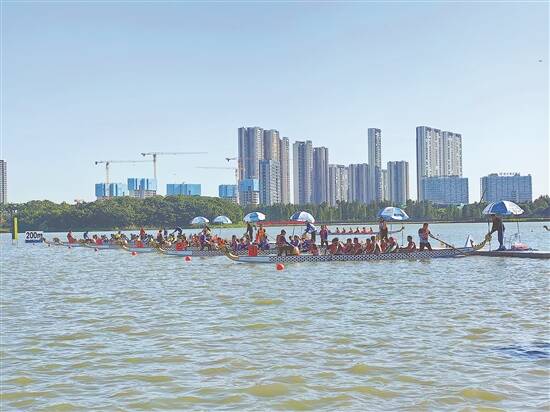 上午9时30分,在一声令下后,龙舟扒手随着“嘿呵嘿呵”的呐喊声奋力向前。即便当日温度较低,运动员们的热情不减。