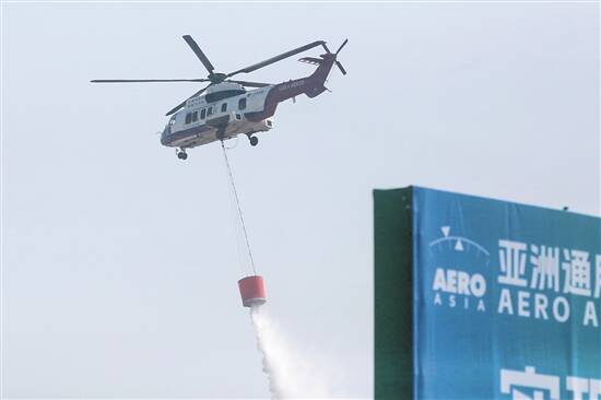 开幕日首日,被誉为“南海神鹰”的交通运输部南海第一救助飞行队为观众带来了一场别开生面的应急救援演练。南海第一救助飞行队搜救机长陈先凯驾驶着S76D中型直升机,以低速的状态腾空而起,经过一段低空飞行后,小半径转弯回到停机坪,开展超低空悬停、释放悬索和救生员救助等动作。另一边,EC225大型救助直升机同时进行消防灭火任务。飞机外挂着消防吊桶,围绕观众席盘旋一周,实施洒水作业。
