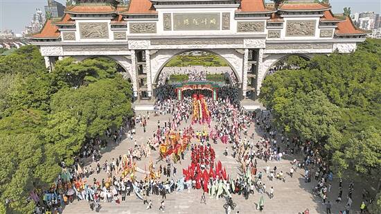 最终,浩浩荡荡的巡游队伍通过顺峰山公园牌坊,完成“过龙门”,如同鱼跃龙门,传达步步高升的寓意。值得一提的是,现场巨型龙头和传统龙头还在牌坊与五行桥之间的空地列阵,市民游客笔蘸朱砂,纷纷为自己的行运风车“点红”“接福”。