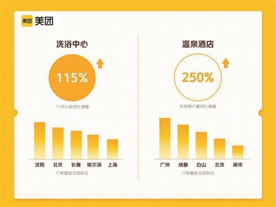 北方人爱洗浴,南方人更爱“泡汤”,不少消费者偏爱在温泉酒店“住着玩”。美团、大众点评数据显示,广州、成都、白山、北京、南京等地预订量领跑全国。相较周中,周末、双旦等节假日的客房热度更高,不少客房已被抢先预订。