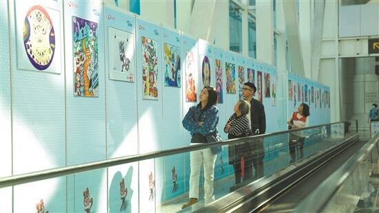 市民观看“文化筑湾区 创意绘非遗”青少年醒狮主题绘画展