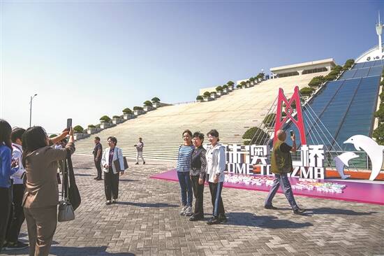 游客们在港珠澳大桥蓝海豚人工岛上拍照打卡 羊城晚报记者 梁喻 摄