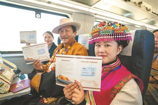 滇藏铁路丽江至香格里拉段于11月26日正式通车,填补了滇西北地区铁路网络的空白。丽香铁路起自云南省丽江市玉龙纳西族自治县丽江站,接入云南省迪庆藏族自治州香格里拉市香格里拉站,设计时速140公里,全长139公里,为国家Ⅰ级单线电气化铁路,两地间最快1小时18分可达。图为乘坐丽香铁路开通首发列车的游客在车厢内展示纪念车票。