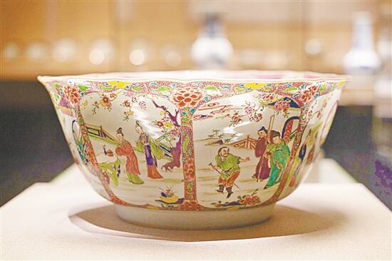 “清雍正 粉彩开光《西厢记》人物故事图潘趣大碗”为广东省博物馆所藏。展柜里柔光映照下,可见这件瓷器呈八角形,每个面各绘有一幅《西厢记》人物故事图,色彩绚丽、构图精美……转动碗身,似乎《西厢记》的故事便在碗上徐徐展开。