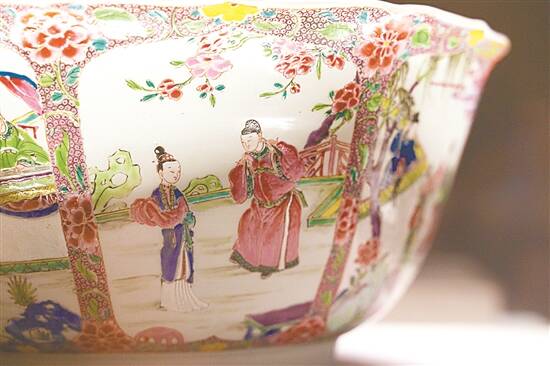 “粉彩开光”是指瓷器的绘制技法,“潘趣大碗”则是瓷器的一种形制,它的体积通常要比一般的生活用碗大得多。据介绍,潘趣酒碗的名字由其英文“Punch Bowl”音译而来,也可以翻译成“宾治”酒碗,它因专门用来调制、盛放潘趣酒而得名。
