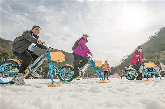 游人在重庆市南川区金佛山北坡滑雪场拍照,体验冰雪乐趣 新华社发